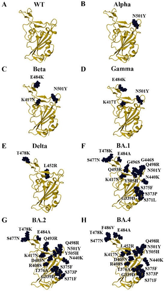 The Omicron parent lineage was classified as a VOC in November 2021 and a previous VOC in March 2023 []. Numerous subvariants have emerged since then, including BA.1, BA.2, BA.4, BA.5, XBB.1.5, XBB.1.16, EG.5, BA.2.86, JN.1, KP.2, and KP.3 (Figure 1 and Figure 2). As seen in Figure 1, the BA.4 and BA.5 subvariants are comprised of the same mutations in the RBD (BA.4/5). In addition to the amino acid substitutions in the RBD, the BA.2.86, JN.1, KP.2, and KP.3 variants have a deletion at residue V483 (Figure 2). In terms of the RBD, the LB.1 and XEC Omicron subvariants contain the same mutations as KP.2 and KP.3, respectively []. The dissociation constants (KD) or half-maximal inhibitory concentration (IC50) values of the RBD–ACE2 receptor interaction for WT and the variants examined in this study were obtained from experimental studies and are summarised in Table S5 [,,,,,,,].