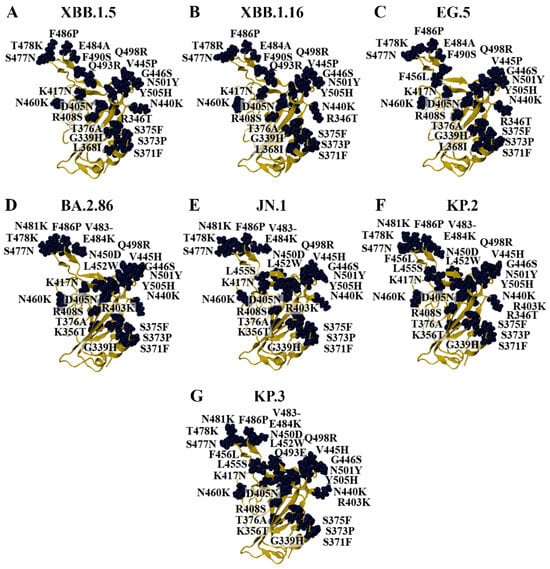 Homology models of Omicron subvariants. Homology modelling was performed to generate the structures of the (A) XBB.1.5, (B) XBB.1.16, (C) EG.5, (D) BA.2.86, (E) JN.1, (F) KP.2, and (G) KP.3 variants using the crystal structure of the wild-type (WT) receptor-binding domain (RBD) as the template (PDB ID: 6M0J).