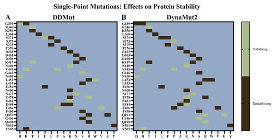 Effects of single-point mutations on the stability of the SARS-CoV-2 receptor-binding domain (RBD). (A) DDMut and (B) DynaMut2 were used to predict the potential effects of mutations that have been reported to occur in the RBD of SARS-CoV-2 variants on protein stability and dynamics. The wild-type (WT) structure was uploaded to the servers and the mutations were classified as destabilising or stabilising.