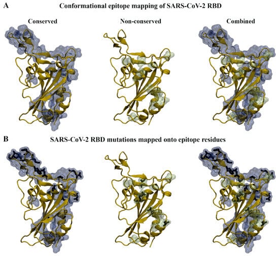 Antigen conformational B-cell epitope mapping of SARS-CoV-2 wild-type (WT) and variants. (A) Sequence and structure-based methods were used to identify conserved and non-conserved epitope residues in WT and variant receptor-binding domains (RBDs). (B) The RBD mutations that fall within the conserved and non-conserved epitope regions can be seen in stick representation.