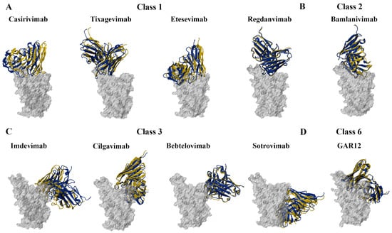 Structures of the wild-type (WT) SARS-CoV-2 receptor-binding domain (RBD) in complex with monoclonal antibodies. Protein–antibody docking was performed using the WT RBD (PDB ID: 6M0J) and crystal structures of (A) class 1, (B) class 2, (C) class 3, and (D) class 6 monoclonal antibodies. The crystal structure complexes were used as a control. Structural alignment was performed using PyMOL, with the aligned RBDs coloured grey. The antibodies from the docked complexes are coloured yellow, while the antibodies from the original crystal structures are coloured blue.
