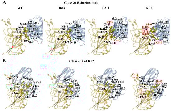 PDBePISA analysis of the docked wild-type (WT), Beta, BA.1, and KP.2 RBD–antibody complexes. The predicted hydrogen bonds and salt bridges can be seen for the class 3 monoclonal antibody (A) bebtelovimab and class 6 monoclonal antibody (B) GAR12. The RBD mutations are coloured red. The antibody residues are italicised. The antibody residues that are part of the light chain are underlined.