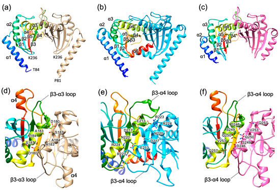 Structural comparison of the periplasmic region of the stator B-subunit from B. subtilis (Bs-MotSc), Salmonella MotBc (St-MotBc), and V. alginolyticus PomBc (Va-PomBc). (a) Cα ribbon representation of Bs-MotSc dimer structure in 92 mM NaCl. One subunit is colored in a rainbow from blue at the N-terminus to red at the C-terminus, and the other is shown in light brown. (b) Structure of Salmonella MotBc (St-MotBc) dimer (PDB ID 2ZVY). One subunit is colored in rainbow, and the other is in cyan. (c) Structure of V. alginolyticus PomBc (Va-PomBc) dimer (PDB ID 3WPW). One subunit is colored in rainbow, and the other is in pink. (d–f) Close-up top view of the dimer interface in (a–c). The side-chains of residues that contribute to inter-subunit interactions are shown as stick models with labels.