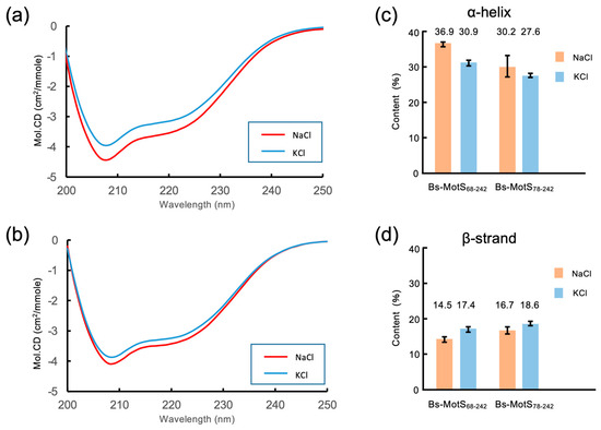 Far-UV CD spectra of Bs-MotSc in high and low sodium concentrations. (a,b) CD spectra of Bs-MotS68–242 (a) and Bs-MotS78–242 (b) at 300 mM NaCl (NaCl) and 25 mM NaCl/275 mM KCl (KCl). (c,d) Estimated secondary structure contents from the CD data.