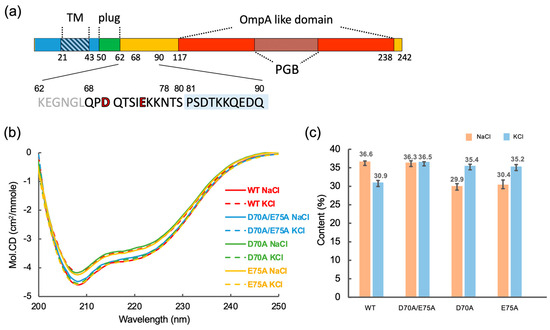 Far-UV CD spectra of Bs-MotSc mutant variants. (a) Primary structure of Bs-MotS. The N-terminus of the α1 helix in the Bs-MotSc structure is shaded in light blue. The mutation sites are highlighted in red font. (b) CD spectra of Bs-MotS68–242 without mutation (wild-type) and with mutations (D70A, E75A, and D70A/E75A) at 300 mM NaCl (NaCl) and 25 mM NaCl/275 mM KCl (KCl). (c) The helical content was estimated from the CD data.