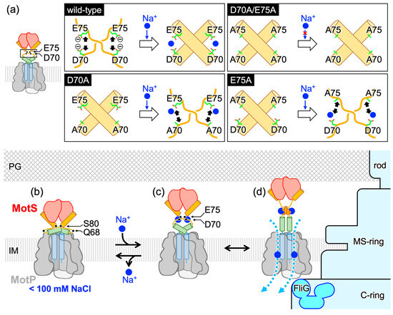 D70 and E75 contribute in a complex way to the coil–helix transition (Figure 5). The α-helical content of the D70A, E75A, and D70A/E75A variants of Bs-MotS68–242 at a low Na+ concentration was at the same level as in the wild-type fragment at a high Na+ concentration, demonstrating that the D70A and E75A mutations stabilize the α-helix structure. However, the α-helical contents of the D70A and E75A variants decreased at a high Na+ concentration, whereas that of the D70A/E75A variant at a high Na+ concentration had the same level of α-helical content as the wild-type protein. This behavior suggests that D70 and E75 cooperatively contribute to the coil–helix transition. If residues 68 to 77 form an α-helix, D70 and E75 will be in opposite positions on the helix and cannot interact with each other. Thus, D70 of one subunit may interact with E75 of the other subunit in the dimer, and Na+ may affect the inter-subunit interactions. The binding of Na+ to D70 (E75) of one subunit of the E75A (D70A) mutant protein may destabilize the formation of the α-helix of the other subunit (Figure 6a).