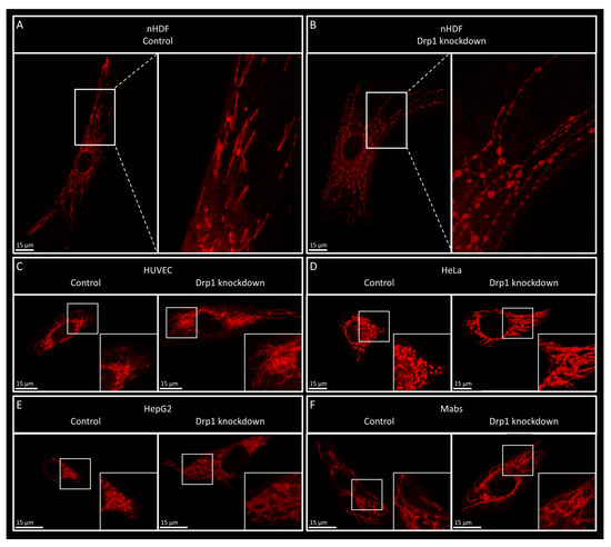 The mitochondrial morphology in a cell with a non-targeting (GFP, left) or Drp1 (right) knockdown. (A,B) In addition to mitochondrial elongation, normal human dermal fibroblasts present with a pearl-necklace-like phenotype upon Drp1 knockdown, which is not present in control cells (enlarged squares). (C–F) Other examined cell types show mitochondrial hyperfusion, but no pearl-necklace-like phenotype following Drp1 knockdown. (C) HUVEC cells. (D) HeLa cells. (E) HepG2 cells. (F) Mesoangioblasts.