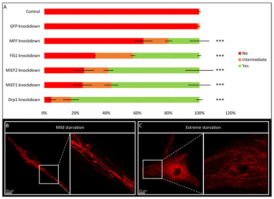 Fibroblasts with the knockdown of one of four other proteins involved in fission (MFF, MIEF1, MIEF2 or FIS1) also presented with the PN phenotype (Figure S2), indicating that the formation of this phenotype is the result of a decrease in fission in general, not just due to Drp1 knockdown. However, the amount of cells presenting with the PN phenotype and severity of the phenotype differed between the various knockdowns. The depletion of Drp1 resulted in the PN phenotype in over 90 percent of cells, while MFF knockdown only presented the phenotype in around 35 percent of cells (Figure 2A). To confirm that the lower levels of PN phenotype upon MFF knockdown arose from the change in gene and not a change in efficiency, the knockdown efficiency was assessed for Drp1 and MFF. Drp1 knockdown resulted in a 70% decrease in gene expression, while MFF knockdown resulted in a 90% decrease (Figure S3). This shows that the mechanism behind the formation of the PN phenotype is not equally dependent on all fission-related factors. Furthermore, to assess whether the phenotype was only present upon fission depletion, or also following increased fusion, fibroblasts were exposed to starvation, which is known to increase mitochondrial fusion activity. Mild starvation resulted in mitochondrial elongation, without the PN phenotype, while the PN phenotype was present in fibroblasts exposed to extreme starvation (Figure 2B,C). Combined, these data indicate the PN phenotype is the result of an imbalance in mitochondrial fission and fusion.