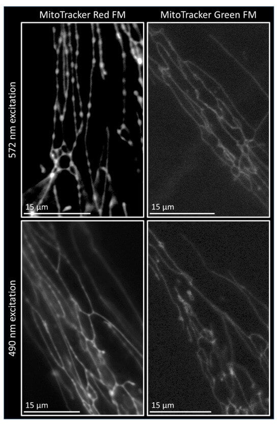 Phototoxicity as the result of ROS production is generally expected to be increased when exciting cells with a shorter wavelength, due to the high energy levels [34]. If this were solely the case for the PN phenotype, it should result in an increase in the phenotype when cells are exposed to a 490 nm light source compared to a 572 nm light source, while the opposite was observed. In fact, the formation of the PN phenotype does not appear to be wavelength-dependent. If wavelength were a determining factor, cells stained with MitoTracker Green FM and excited a 572 nm light should result in the PN phenotype, while cells stained with MitoTracker Red FM and excited with 490 nm light should not. Instead, the PN phenotype is dye-dependent, with dyes that have excitation peaks in the orange/red spectrum presenting with the phenotype (Figure 4). Furthermore, the level of excitation of these dyes is a factor in the extent to which the PN phenotype is formed. Red dyes excited with 490 nm light results in the phenotype to a lesser extent than 572 nm, likely through the less-efficient excitation of red dyes at 490 nm. Aside from the excitation wavelength, a difference between the dyes used is their dependence on the mitochondrial membrane potential (MMP) for import into the mitochondria. Where MitoTracker red FM and TMRM are highly dependent on the MMP, MitoTracker CMX-ROS is only partially dependent, and the import of MitoTracker Green FM is the least dependent on the MMP [35]. Previous research has shown distinct phototoxicity in cells stained with red MitoTrackers, which was absent upon staining with various green dyes (Rhodamine123, MitoTracker Green, JC-1) [36,37]. Both Rhodamine123 and JC-1 are also highly dependent on the MMP [35], suggesting that the difference between red and green/orange dyes is not the result of MMP dependency. Additionally, the damage in this previous study was less severe in the presence of supplemented antioxidants, indicating that the cause of the damage was indeed ROS production [37]. This suggests that there might be a chemical reaction resulting in ROS production that is specific to red dyes. MitoTrackers have been suggested to artificially alter the mitochondria during imaging. For example, MitoTracker Orange has been noted to inhibit Complex I, and similar effects have been observed for MitoTracker Red and Deep Red [35]. Additionally, TMRM has been suggested to have an inhibitory effect on the electron transport chain. While changes to mitochondrial morphology have not been described, changes in mitochondrial function are known to result in morphological changes. This study clearly shows morphological changes as the result of MitoTracker presence, which can result in the misinterpretation of data.