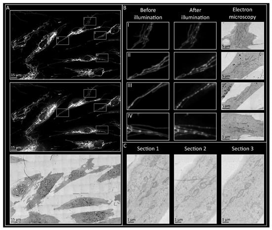 Cells with pearl-necklace phenotype, with fluorescent and electron microscopy. (A) Pearl-necklace phenotype was successfully induced with illumination and induced cells were re-identified following EM sample preparation. (B) Zoomed in areas of induced cells, before and after PN phenotype induction, with corresponding areas from EM images. (C) Mitochondria presenting with pearl-necklace phenotype in fluorescent microscopy could be found in multiple serial electron microscopy sections.