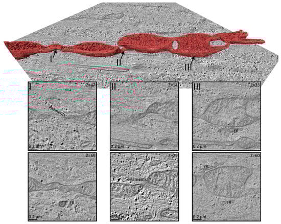 For serial electron tomography, the same mitochondria were localized in multiple sections and tilt series were acquired. The 3D reconstruction confirmed the presence of the PN phenotype, characterized by alternating constricted and expanded mitochondrial regions (Figure 6). The mitochondrial double membrane remained intact in both constricted and expanded regions, indicating that no fission events had occurred at this stage (Figure 6). Similarly, cristae were observed in both the constricted and expanded areas. However, in the most expanded mitochondrial regions (Figure 6(III)), cristae were present along the outer edges but absent in the middle, suggesting a somewhat altered cristae structure in the PN phenotype. Additionally, ER and actin and/or intermediate filaments were found near the constricted areas (Figure 6), indicating mitochondrial pre-constriction by the ER, which occurs before mitochondrial fission.