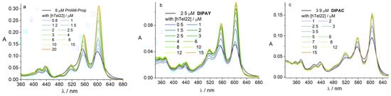 Absorption spectra of PHAM-Prop (a), DIPAY (b) and DIPAC (c) titrated with hTel22 in 10 mM K-phosphate buffer of pH 7 with 100 mM K+. Optical path 1 cm.