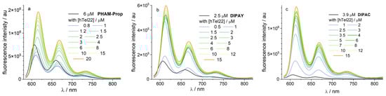 Fluorescence spectra of PHAM-Prop (a), DIPAY (b) and DIPAC (c) titrated with hTel22 in 10 mM K-phosphate buffer of pH 7 with 100 mM K+. Optical path 1 cm. Solutions were excited in isosbestic point at 574 nm (a), 572 nm (b) and 570 nm (c).