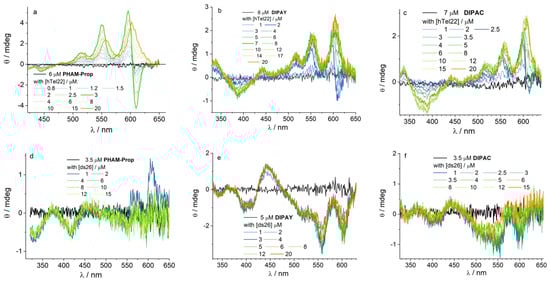 Visible circular dichroism spectra of PHAM-Prop (a,d), DIPAY (b,e) and DIPAC (c,f) titrated with hTel22 (a–c) and ds26 (d–f) in 10 mM K-phosphate buffer of pH 7 with 100 mM K+. Optical path 2 cm.
