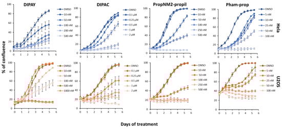 Hela and U2OS cells were seeded and chronically exposed to the indicated concentrations of the compounds. Growth was monitored by Incucyte every 12 h for 5 days. The curves report the % of confluence measured by live-cell imaging. One representative of three independent experiments with similar results.