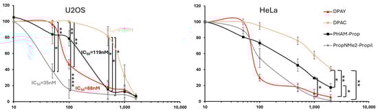 Based on previous results showing the significant cytotoxicity of NDI dyads in living cells and knowing the biological relevance of G4 stabilizing agents in cancer biology, we evaluated the biological activity of both monomers, PropNMe2-Propyl and PHAM-Prop, as well as both the DIPAY and DIPAC dyads in two different human cancer cell lines possessing long (U2OS) and short (Hela) telomeres. First, we chronically exposed cells to different concentrations of the compounds, and then we followed their growth in a real-time quantitative live-cell imaging system, quantifying the confluence of cell cultures for different treatments every 12 h (Figure 4). Notably, all the compounds induced cytotoxic effects on both cell lines at different dose ranges. Subsequently, based on the dose-dependent cytotoxicity of the compounds, we selected a sub-range of concentrations of each compound to determine the percentage of survival inhibition after treatment and the IC50 values, to compare their cytotoxicity in the two cell lines. As shown in Figure 5, the compounds showed very different IC50 values, and, more interestingly, compared to Hela, U2OS cells appeared more sensitive to all compounds except the DIPAY. Indeed, between the two dyads, the DIPAY resulted in being much more effective in terms of survival inhibition.