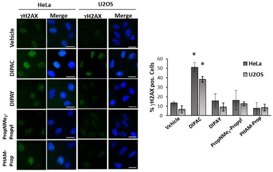 Hela and U2OS cells were seeded and treated with IC50 concentrations of the compounds. After 24 h, the cells were fixed and processed for immunofluorescence with an anti-γH2AX-specific antibody followed by a FITC-conjugated secondary antibody and counterstained with DAPI (representative images at 63× magnification are shown in the upper panels). The percentage of γH2AX foci-positive cells was scored and is reported in the histograms (lower panel). The graph reports the mean of three independent experiments. Bars are SD. Statistically significant differences were calculated by Student’s t-test. Scalebar = 10 μm. * = p < 0.05.