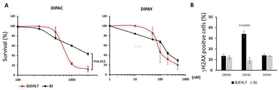 To assess the selectivity of the compounds for cancer cells, DIPAY and DIPAC were administered to normal primary (BJ) and hTERT-immortalized, large T SV40 antigen-transformed (BJEHLT) human foreskin fibroblasts. As shown in Figure 7, DIPAC displayed a good selectivity for BJEHLT compared to primary BJ, with DIPAC being more cytotoxic in the BJEHLT cell line, whereas DIPAY’s cytotoxic effect was comparable in the two cell lines (Figure 7A). Consistent with that, the IC50 dose of DIPAC (500 nM) triggered DDR activation, measured as the percentage of γH2AX-positive cells, in transformed but not in primary cells, confirming both the selectivity of DIPAC for transformed cells and the involvement of the DNA damage response pathway in the cytotoxic effect. On the contrary, DIPAY was not able to induce DDR in any of the cell lines analyzed, despite its elevated cytotoxicity, suggesting the involvement of other mechanisms. To finally ascertain telomeric G4s as a DIPAC target, we performed an immunofluorescence–FISH experiment in cells treated with an IC50 dose of DIPAC, with an anti-γH2AX-specific antibody and a cy3- telo-PNA probe to hybridize telomeric sequences. Due to the intense emission of DIPAC in the red channel, only U2OS cells, which possess long telomeres, displayed sufficiently intense spots of the cy3- telo-PNA probe, recognizable from the DIPAC fluorescence background, to allow the analysis. As shown in Figure 8, DIPAC treatment induced a significant increase in the TIFs per nucleus, as well as the percentage of cells displaying TIFs (Telomere’s Dysfunction-Induced Foci), corresponding to co-localizations between γH2AX foci and telomeric signals. We can thus confirm that DIPAC is indeed targeting telomeres, among other targets.