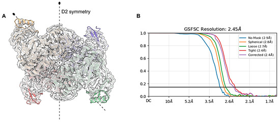 Cryo-EM studies of PGMTk. (A) A refined model of tetrameric PGMTk fitted into a cryo-EM map in D2 symmetry. (B) Gold standard Fourier shell correlation (FSC) curve with a nominal resolution of 2.45 Å at 0.143 FSC.