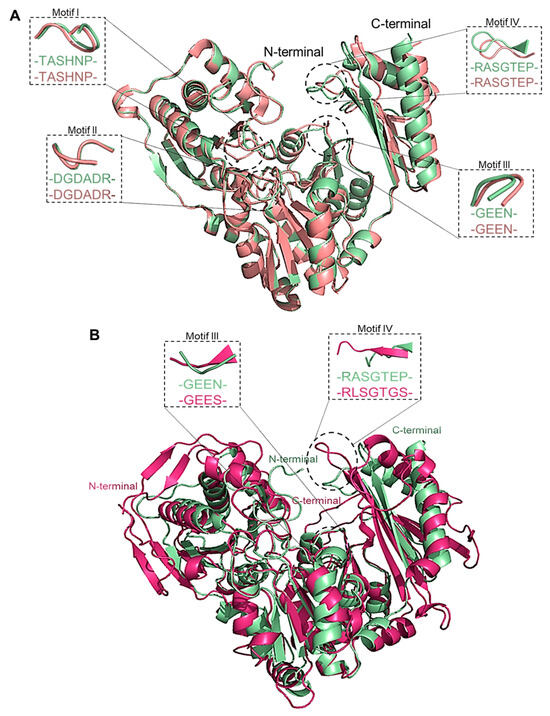(A) Superimposition of the protomers of PGMTk (pale green) and PGMPh (salmon red) performed by PyMol (ver. 3.0.2). Insets show conserved motifs reported for PGMs. (B) Superimposition of the protomers of PGMTk (pale green) and PGMOc (1LXT: purple-pink) showing the location of modified motifs III and IV in both structures. Alignment was performed using PyMol (ver. 3.0.2).