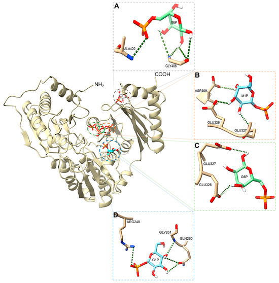 Multiple sequence alignment confirmed the presence in PGMTk of conserved amino acid residues that represent a signature for phosphohexomutases [27] (Figure S8). PGMTk was docked with G1P, G6P, mannose 1-phosphate (M1P), and mannose 6-phosphate (M6P); results were viewed using PoseView Online (https://proteins.plus/help/poseview (accessed on 5 November 2024)) [32]. Docking analysis showed the involvement of the sidechains of multiple residues in binding the hexose phosphate substrates, thus highlighting unique substrate binding sites in PGMTk. Arg248, Gln260, and Gly261 are involved in binding with G1P, with Arg248 residing in the conserved motif II, domain II. Residues from conserved motif III, domain III interact with G6P (Glu326 and Glu327) and M1P (Asp309, Glu326, and Glu327), while residues Gly406 and Ala420 from domain IV participate in binding to M6P (Figure 8). The predicted binding affinities for G1P (−5.025 kcal mol−1), G6P (−4.987 kcal mol−1), M1P (−4.682 kcal mol−1), and M6P (−4.565 kcal mol−1) indicate that the interaction of PGMTk with G1P is the strongest, followed by G6P, M1P, and M6P. Our protein–ligand docking results are in accordance with the reported functions of the domains of hexomutases, where residues from domains I and IV are found to be involved in phosphotransferase activity, and domain II is reported to stabilize the overall protein structure. However, the involvement of multiple residues in binding with different hexose phosphates is unique to PGMTk, but that observation should be confirmed by further experimentation based on ligand-bound enzymes.