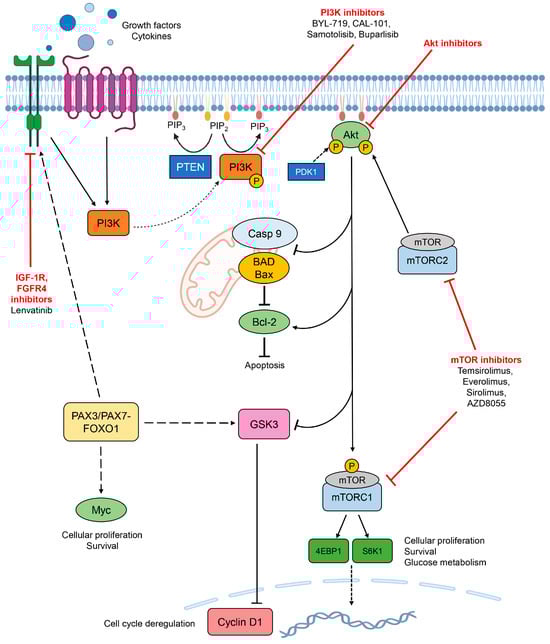 Current treatments for RMS patients are based on surgery, radiotherapy, and a three-drug chemotherapy with vincristine, actinomycin D, and cyclophosphamide []. However, in some cases, the prognosis is still poor, and chemotherapy shows little activity in metastatic cases []. For these reasons, innovative approaches are needed. Targeted therapies have been demonstrated to be successful in the treatment of many types of cancer due to the identification of specific signature and signaling networks of a certain tumor. The deregulation of cell growth and survival, caused by the activation of PI3K signaling, contributes to competitive growth advantage and often to therapeutic resistance []. Therefore, this pathway is an interesting target for the development of new anticancer agents. As a matter of fact, many inhibitors targeting key components of the pathway (Figure 3) are being developed by pharmaceutical companies and are currently under preclinical and clinical trials []. These targeted therapies can be divided into four main groups, based on the selected component of the cascade: PI3K inhibitors, dual PI3K-mTOR inhibitors, mTOR inhibitors, and Akt inhibitors. In addition, other molecules may be used for interfering with the pathway, for instance, PDK1 or PtdIns analogues [].