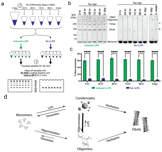 - Hochmair, J.; Exner, C.; Franck, M.; Dominguez-Baquero, A.; Diez, L.; Brognaro, H.; Kraushar, M.L.; Mielke, T.; Radbruch, H.; Kaniyappan, S.; et al. Molecular crowding and RNA synergize to promote phase separation, microtubule interaction, and seeding of Tau condensates. EMBO J. 2022, 41, e108882. [Google Scholar] [CrossRef]