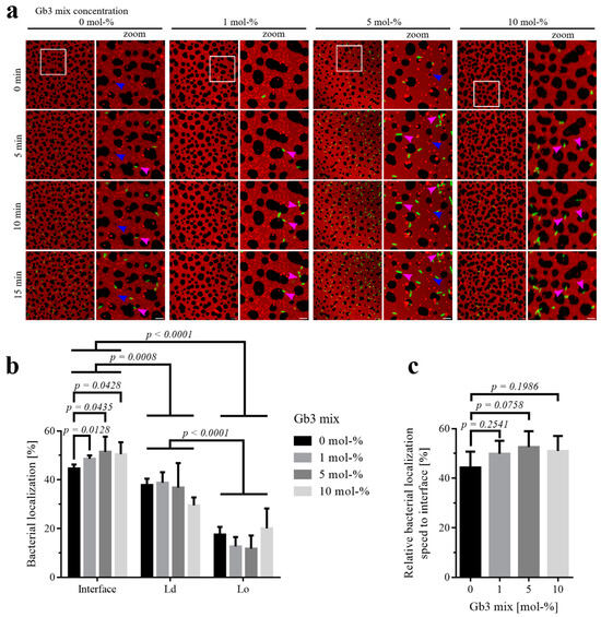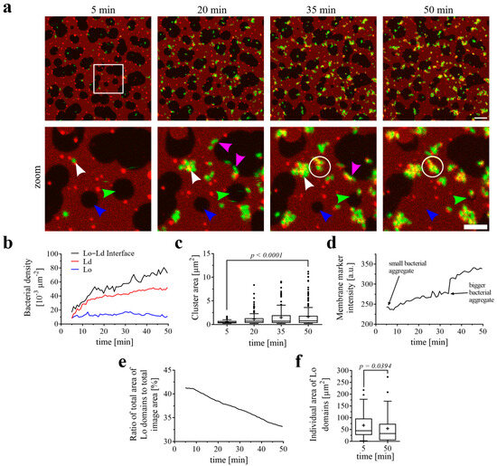 Captured images and image series from fluorescence microscopy experiments were analyzed by custom ImageJ (v1.54, NIH, Bethesda, MD, USA) scripts that are available on GitHub: https://github.com/taras-sych/SLB-tools (accessed on 2 December 2022). Both differentiating bacteria from the background and defining Lo and Ld domains were accomplished by utilization of thresholds. Interfaces between Lo and Ld domains are assigned by a 1 µm wide line between phases, and bacteria in each location (Lo, Ld, Lo–Ld interface) were counted. The areas of Lo and Ld phases were calculated as a percentage of the total area of the frame. Bacterial clustering was quantified as follows: An intensity value was determined to separate single bacteria from noise. This value was used as a threshold to differentiate bacterial clusters from the background, which allowed the calculation of cluster areas. Statistical analysis was performed using the Mann–Whitney U test. In box plots, the box indicates the interquartile range (25–75% data points), with whiskers and outliers determined using the Tukey method. The horizontal line indicates the median and the “+” symbol the mean value.