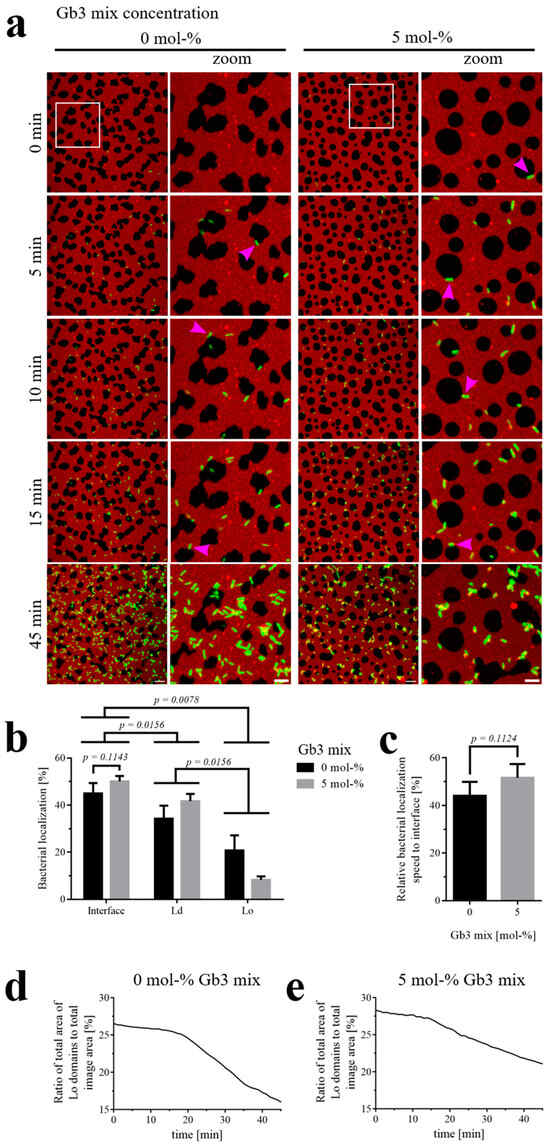 In order to investigate this phenomenon in more detail and from a different angle, we established SLBs supplemented with FSL-Gb3, a phospholipid-based synthetic Gb3 analog (Function-Spacer-Lipid with globotriose trisaccharide), which is almost exclusively incorporated into Ld domains [39]. LecA was able to reorganize SLBs containing FSL-Gb3 and dissolve Lo domains as well (Supplementary Figure S1e and Supplementary Movie S6). Can the effects described above for the Gb3 mixture be confirmed by using a single Gb3 species, or would bacteria only colonize in the Ld phase?