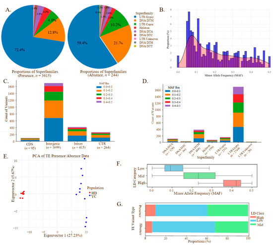 The TIP distribution analysis revealed significantly higher variant frequencies in intergenic regions (1699), compared to introns (415), UTRs (264), and CDSs (95). Across each category, the variant frequency exhibited a consistent decrease as the MAF bins increased from 0–0.1 to 0.4–0.5 (Figure 3C). Notably, specific superfamily groups exhibited similar patterns: 2764 TIPs in LTR/Gypsy, 488 in DNA/DTM, 231 in LTR/Copia, 156 in Helitron, 128 in DNA/DTA, 56 in DNA/DTC, and 28 in LTR/Unknown (TIP counts > 10 for each superfamily) (Figure 3D). Across all the superfamilies, a consistent negative correlation between the variant frequency and the MAF bins was observed, indicating a purifying selection on these TIPs (Figure 3D). The PCA of the TIPs demonstrated a significant genetic differentiation between the HD and YC populations, highlighting the role of the TIPs in distinguishing genetic ancestry (Figure 3E). The LD analysis with the nearby SNPs revealed that 51.4%, 39.0%, and 9.6% of the TE variants exhibited low, intermediate, and high LD, respectively (Figure 3F). A positive correlation was observed between the MAF and the LD, with the higher MAF variants more frequently exhibiting a high LD (Figure 3F). This pattern was consistent for both TE insertions and deletions (Figure 3G). Notably, the LD category assignments were largely consistent between insertions and deletions (Figure 3G), supporting the observation that common alleles tend to be in high-LD states.