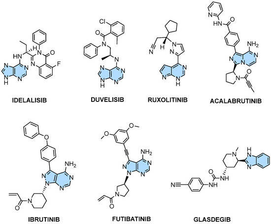 Targeted therapies of idelalisib and duvelisib include the inhibition of phosphatidylinositol 3-kinase (PI3K), while acalabrutinib and ibrutinib emerged as Bruton’s tyrosine kinase (BTK) inhibitors [35] and ruxolitinib as Janus kinase (JAK) inhibitors [36]. Futibatinib is a highly selective irreversible fibroblast growth factor receptor 1 (FGFR) inhibitor in patients with advanced solid tumors [37] and glasdegib acts as a SMO inhibitor [38].