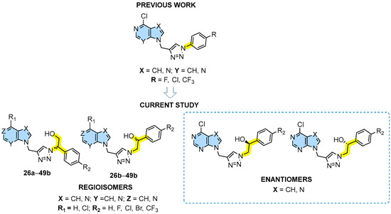 2.2.1. General Procedure for the Synthesis of Racemic Aryl-Substituted Purine Bioisosteres with Primary Hydroxyl (26a−49a) and Secondary Hydroxyl (26b−49b) Groups