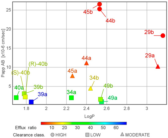 Permeability is also influenced by a high efflux ratio for the majority of compounds. Compounds 29b, 44b, and 45b had the highest permeability and low efflux, but also had high metabolic clearance, while compounds 39a, 39b, 40a, and 40b with low clearance demonstrated low permeability and higher efflux values, as shown in Figure 5.