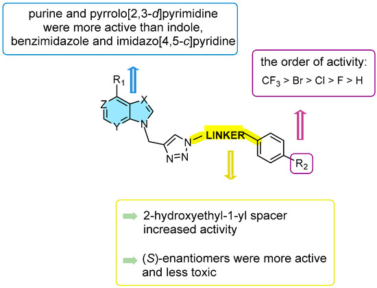 In continuation of our previous study on the antiproliferative activity of purine and pseudopurine derivatives [39,40,41,42,43], herein we propose the synthesis of selected racemic N-heterocyclic analogs with hydroxyethyl linker containing primary and secondary hydroxyl groups, instead of directly connected aromatic and 1,2,3-triazole scaffolds (Figure 2) [43]. The introduction of a spacer between the heterocyclic moieties enables additional flexibility in structural preorganization, while the introduction of the primary and secondary hydroxyl groups affects both the biological and physicochemical properties of the prepared molecules [44]. The physicochemical properties can be significantly altered by the introduction of a hydroxyl group, mainly by increasing the polarity and thus the solubility in aqueous media.