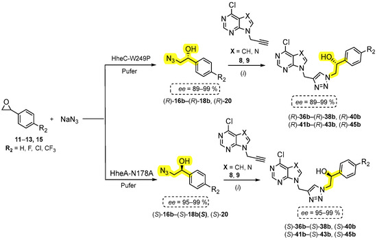 Enantiomers of 6-chloropurine and 4-chloropyrrolo[2,3-d]pyrimidine with hydroxyethyl linker were obtained via the biocatalytic ring-opening of epoxides with halohydrin dehalogenase to afford optically pure ß-substituted azido alcohols that subsequently, with N-propargylated 6-chloropurine and 4-chloropyrrolo[2,3-d]pyrimidine, gave the corresponding (R)- and (S)-N-aryl-substituted derivatives (R)-36b–(R)-38b, (R)-40b (R)-41b–(R)-43b, and (R)-45b and (S)-36b–(S)-38b, (S)-40b, (S)-41b–(S)-43b, and (S)-45b, respectively. Ultrasound-assisted synthesis and the catalytic asymmetric route using halohydrin dehalogenase contribute to a more sustainable synthetic approach to obtaining the target compounds.