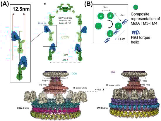 Figure 2. (A) Revised switching model. Recent works suggest a model in which the overall dimensions of the FliG ring remain almost unchanged during switching but that the stator units move closer to the basal body in the CW state [75,76]. Pseudo-atomic models depict ~12 nm displacement of the top of the MotA pentamer between the CW and CCW states [75,76]. Reproduced with permission from Springer Nature. (B) Imperfections in MotA-FliG arclengths: MotA–MotA spacing is variable within pentamers that are asymmetric [42]: i.e., D4–3 ≠ D3–2. These and other factors can contribute to unequal traversing of arclength during the 72-deg rotational displacement of the MotA subunits. However, flexibility within the torque-helix/FliG domains and in the MotA–MotA spacing could help deform the interfaces, compensating for minor imperfections.