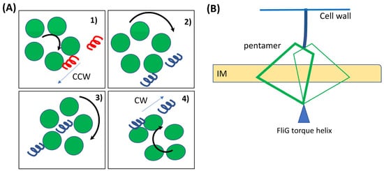 Based on the arrangement of charged residues along the inner MotA-MotB interfaces, it has been hypothesized that the pentamer rotates CW unidirectionally around the dimer [43]. This compelling idea suggests a plausible mechanism for the switch in the direction of rotation [45]. The rotating pentamer could change the direction of rotation of the FliG ring by functioning as an external driver gear during CCW motor rotation and as an internal driver gear during CW motor rotation [41,43,45,73].