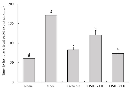 After the mice were fasted for 24 h, they were gavaged with activated charcoal water. The time the mice took to expel the first black fecal pellet was noted. The normal group took the shortest time to expel the fecal pellet, which was 62 min (Figure 2). By contrast, the model group took the longest time to expulsion (172 min). Lactulose, a drug effective for constipation treatment in clinics, was used here as the treatment control for gavaging the mice. The time taken by the lactulose group to expel their fecal pellet decreased significantly compared with the model group (82 min). Similarly, LP-HFY11 could also reduce the expulsion time in the mice. The expulsion time for the LP-HFY11H group was 75 min, which was shorter than that for the lactulose (general drug dosage) group.