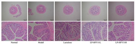 The mice in the normal group had the largest fecal weight, particle number, and water content, whereas the mice in the constipation control group had the lowest, as seen in Table 2. Lactulose and LP-HFY11 were able to significantly mitigate the constipation-induced reduction in fecal weight, particle number, and water content (p < 0.05). Constipated mice’s fecal weight, particle number, and water content were the closest to those of the normal group thanks to LP-HFY11H. Lactulose is a commonly used constipation drug. The clinical dosage was calculated for experimental mice in this experiment, and the high dose of LP-HFY11 (LP-HFY11H) was the recommended intake of probiotics. It can be seen that the recommended intake of probiotics is stronger than the dosage of lactulose. At the same time, the effect of LP-HFY11 at both high and low doses is better than that of LP-YS3, which has been proved to have constipation inhibition effect, and the effect is close to that of LP-CQPC10. Therefore, it can be preliminarily concluded that LP-HFY11 has the same research value as the probiotics LP-YS3 and LP-CQPC10, which have been proved to have a good constipation effect and can be followed up.