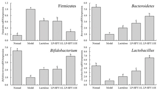 When analyzing the microbial mRNA expression intensity in the mouse gut contents, we noted that the proportion of Firmicutes bacteria was the lowest in the normal group (Figure 5). LP-HFY11 could reduce the proportion of Firmicutes bacteria among the intestinal microbes of the constipated mice. Meanwhile, the normal group exhibited the highest proportions of Bacteroidetes and Bifidobacterium. LP-HFY11H could make the proportions of Bacteroidetes and Bifidobacterium in the intestinal contents of the constipated mice closest to that in the normal group. Additionally, the intestinal contents of the LP-HFY11H group had the highest proportion of Lactobacillus.