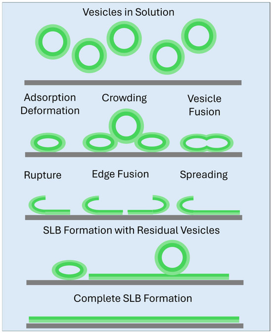 Various processes that may occur leading to the formation of a supported lipid bilayer when a solution of vesicles comes into contact with a surface have been discussed in the literature [34,35,36,37]. A schematic representation presented by the Israelachvili lab [35] is shown in Figure 1. Under sufficiently adhesive conditions, isolated vesicles from the solution can adsorb to the substrate surface. If the adhesion is strong enough or the vesicle is in a stressed state (e.g., osmotically), the isolated vesicle can deform and generate intra-bilayer stresses sufficient to promote vesicle rupture, forming a bilayer island on the surface [34]. If the strength of adhesion is not strong enough to rupture isolated vesicles on the surface (as is the case with PC bilayers on silica), the vesicles require additional stresses from neighboring vesicles to cause rupture, that is, a critical vesicle concentration on the solid substrate. After the initial rupture of vesicles, subsequent vesicles can fuse with the unfavorable edges of the bilayer patches, through hydrophobic interactions between the tails of the lipids in the highly curved regions of the bilayer edge and the stressed vesicle [36]. This process continues until the bilayer is complete, at which point excess lipid and water may be ejected back into solution.