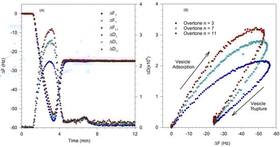 where ρf is the density of the film on the crystal surface. As in Equation (2), the first term in the expressions for ΔF and ΔD are due to the solvent effect and they vanish when we consider changes in film properties when the crystal is immersed in the liquid both before and after exposure to the vesicle solution. The second term in ΔF is the Sauerbrey contribution that is already present in Equation (2) and the third term in ΔF accounts for a correction to the Sauerbrey mass coming from the viscoelasticity of the film. The second term in ΔD is the direct contribution to dissipation arising from the viscoelasticity of the film. An increase in ∆D corresponds to a decrease in the storage modulus G′ and indicates a less rigid, possibly more disordered film. A decrease in ∆D corresponds to an increase in the storage modulus and indicates a more rigid film on the crystal surface. As mentioned earlier, when a rigid SLB forms, the frequency and dissipation changes at all overtones converge to effectively a single value of ∆F and ∆D, while when a viscoelastic film of partial bilayer accommodating some intact vesicles forms, the ∆F and ∆D values at various overtones diverge. The characteristic QCM-D signatures associated with the formation of SLB from vesicles are shown in Figure 2, for experiments conducted with a single component zwitterionic lipid, DOPC.