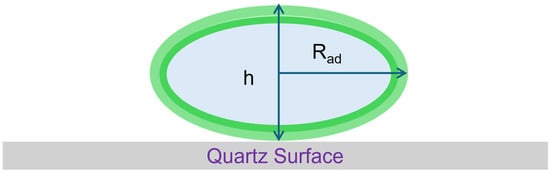 It has been previously proposed in the literature that vesicles adsorbed on the surface possess a pancake-like shape [41,42,43,44], which is schematically shown in Figure 3. The shape of the adsorbed vesicle is determined by the competitive factors of the adsorption energy of the vesicle with the quartz substrate, curvature energy associated with the bilayer bending, membrane tension due to the areal changes in the bilayer, and osmotic stress due to the volume changes in the vesicle.