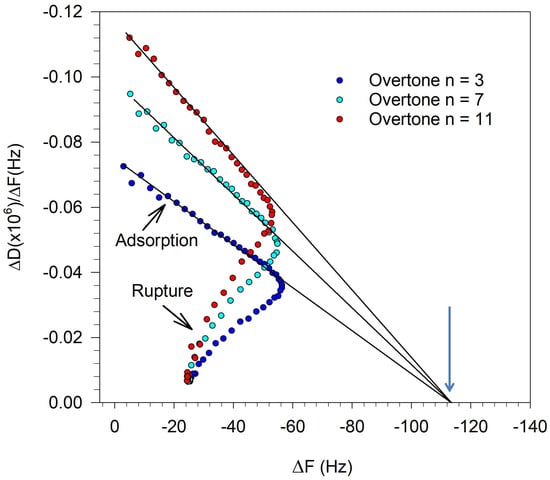Determining the height of the deformed vesicle by the approach proposed by Reviakine et al. [43]. ΔD and ΔF values used in this plot at various overtones correspond to those shown in Figure 2 for SLB formation from DOPC vesicles. The extrapolation of the data to obtain the intercept used the portion of the QCM-D trace representing vesicles adsorbing on the quartz crystal surface. Arrow indicates the ΔF value at the intercept.