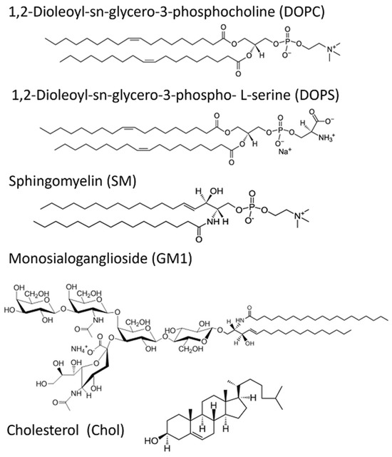 For reasons discussed earlier, we chose to reproduce the experimental conditions used by Sasahara et al. [32,33] in terms of the type of lipids and the composition of the lipid mixture. 1,2-Dioleoyl-sn-glycero-3-phosphocholine (DOPC), 1,2-dioleoyl-sn-glycero-3-phospho-L-serine (DOPS), sphingomyelin (SM; egg, chicken), cholesterol (Chol; ovine wool), and monosialoganglioside (GM1; brain, ovine-ammonium salt) were purchased from Avanti Polar Lipids, Inc. (Alabaster, AL, USA). According to the vendor, the transition temperatures of DOPS and DOPC were −11 °C and −17 °C, respectively. Egg sphingomyelin was mostly 16:0 sphingomyelin with a small percentage of 18:0 and 22:0 sphingomyelin. The transition temperatures for SM 16:00, 18:00, and 22:00 were reported by the vendor to be 40.5 °C, 45 °C, and below 47.5 °C, respectively. The chemical structures of the lipid components used in this study are shown in Figure 5.