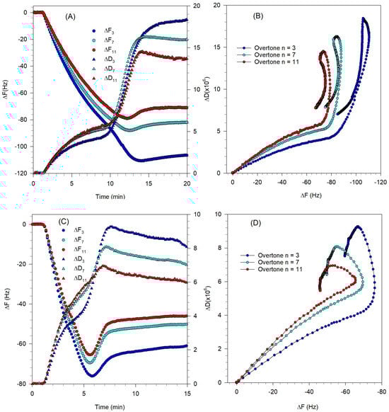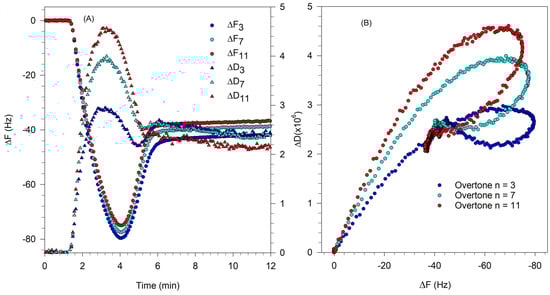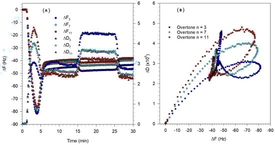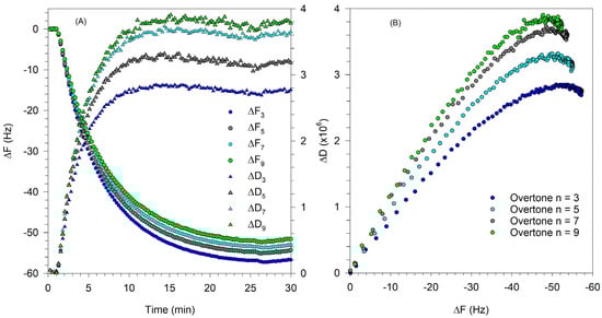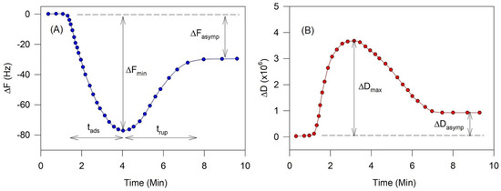 The relation between the experimentally observable variables of frequency change ∆F and dissipation change ∆D to the mass of the film and its viscoelastic properties has been well established in the literature [39,40]. For a rigid film on the crystal surface when the crystal is in air, the frequency change ∆F and the areal mass of the film deposited on the crystal, mf (mass per unit area) are related by the Sauerbrey equation. The dissipation change ∆D, by definition, is zero.