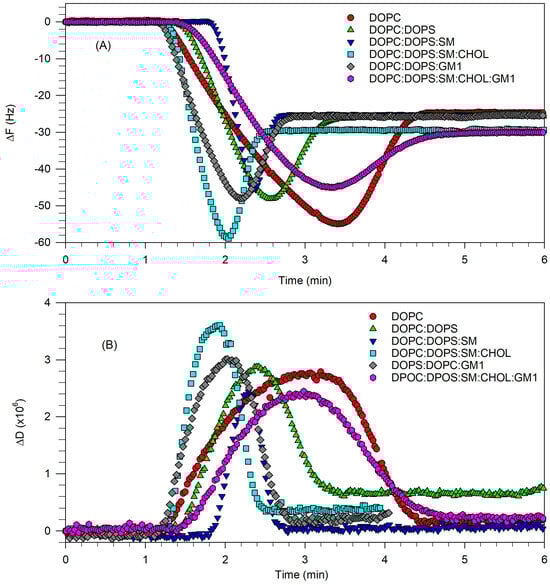 QCM-D data were obtained by a Q-Sense E4 series (Q-Sense AB, Gothenburg, Sweden) instrument with silicon dioxide-coated crystals (5 Hz) purchased from Biolin Scientific (Gothenburg, Sweden). In the cleaning step, the crystals were rinsed with sequential flows of ethanol, deionized water, and 2% sodium dodecyl sulfate and de-ionized water each for 5 min. After that, crystals were thoroughly dried with nitrogen gas and etched with two cycles of 45 s oxygen plasma cleaning using Plasma Prep II (SPI Supplies, West Chester, PA, USA). The experimental procedure began with setting a baseline in the dilution buffer. To form a stable SLB on a crystal, the lipid solution is injected into the QCM-D chamber at 0.15 mL/min to allow vesicles to attach to the silica-coated crystal surface. After the vesicles ruptured to form a stable bilayer, the crystal was rinsed with buffer (referred to as rinse buffer in the text) to remove unattached lipid vesicles and excess molecules [3,46,47,48].