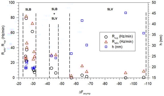 The apparent rate of vesicle adsorption (Rads), the apparent rate of vesicle rupture (Rrup), and the thickness (h) of the deformed vesicles on the surface are all plotted in Figure 14 against the corresponding asymptotic value of the frequency change, ΔFasymp. The observed frequency changes of ~26 and ~30 Hz, combined with dissipation changes below 0.5 × 10−6, correspond to the formation of a complete rigid SLB. The observed frequency changes of 42 to 46 Hz combined with dissipation changes above 1.0 × 10−6 correspond to the formation of a soft viscoelastic layer of partial SLB with embedded intact vesicles and entrapped water, on the crystal surface. The observed frequency changes of 55 Hz and above combined with dissipation changes in the range of 1.0 × 10−6–20.0 × 10−6 correspond to the formation of a supported layer of vesicles (SLVs) with entrapped water in between. In this case, the film on the crystal surface is also soft and viscoelastic. The rate of vesicle adsorption is generally greater than the rate of vesicle rupture. In all cases when an SLB is formed, both the rates of vesicle adsorption and vesicle rupture are larger compared to the case where a complete SLB is not formed. Indeed, when only a supported lipid vesicle (SLV) layer is formed, the rate of vesicle adsorption is the smallest and the rate of vesicle rupture is zero. In all cases when an SLB is formed, the vesicles deform to a thickness of about 20 nm or below.