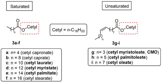 Cetylated fatty acids (CFAs) have emerged as a promising class of compounds in the management of musculoskeletal disorders, demonstrating anti-inflammatory and pain-relieving properties. The most renowned CFA is cetyl myristoleate, also known as CMO (Figure 1), which was first identified for its potential in treating arthritis [2]. From a molecular perspective, CFAs are naturally occurring lipophilic esters derived from plant and/or animal sources, consisting of fatty acids esterified with cetyl alcohol (possessing a linear saturated C16 alkyl chain). In addition to the aforementioned CMO, this series of compounds generally includes other analogues such as cetyl myristate, cetyl palmitoleate, cetyl palmitate, cetyl oleate, and cetyl laurate (Figure 1) [3,4].