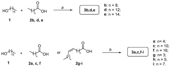In a two-neck round-bottom flask, flame-dried, and under an Argon atmosphere, commercially available hexanoic acid 2a, dodecanoic acid 2c, stearic acid 2f, (Z)-tetradec-9-enoic acid 2g, (Z)-hexadec-9-enoic acid 2h, or oleic acid 2i (1.0 equiv., 0.37 mmol) was dissolved in anhydrous dimethylformamide (1.8 mL) under stirring. Subsequently, 1-ethyl-3-(3-dimethylaminopropyl)carbodiimide (EDCI) (1.1 equiv., 0.41 mmol) and hydroxybenzotriazole (HOBt) (1.1 equiv., 0.41 mmol) were added. After 15 min, 1-hexadecanol 1 (1.1 equiv., 0.41 mmol) and diisopropylethylamine (DIPEA, 1.1 equiv., 0.41 mmol) were added. The mixture was stirred overnight at room temperature. Upon confirming the complete consumption of the starting material, the reaction mixture was extracted with ethyl acetate (3x), and the organic phase was washed with brine (2x), dried over Na2SO4, filtered, and concentrated under reduced pressure. The crude product was purified by silica gel column chromatography using a n-hexane/ethyl acetate mixture 95:5 as the eluent, yielding the desired esters 3a,c,fi.